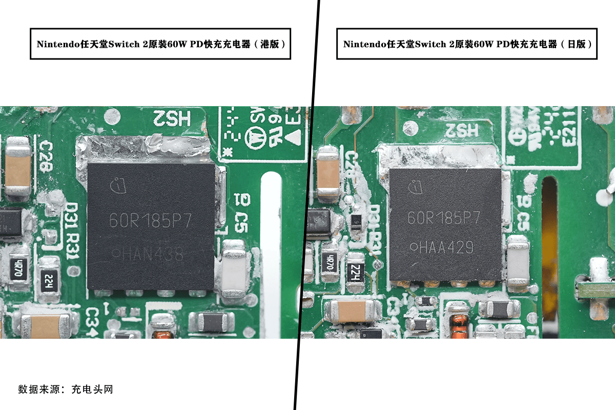 充电头网已拆解了Switch 2港版和日版两个不同版本的原装60W充电器,这次为大家带来两个版本的拆解对比,看看这两个版本在设计用料上都有哪些不同。
