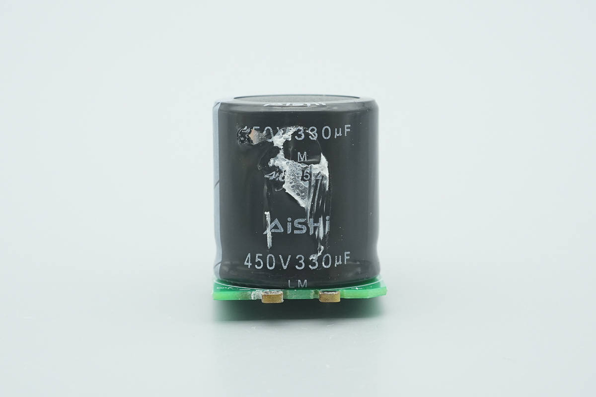 高压滤波电容来自艾华,为LM系列105℃耐热电解电容,规格为450V330μF,焊接小板转接。