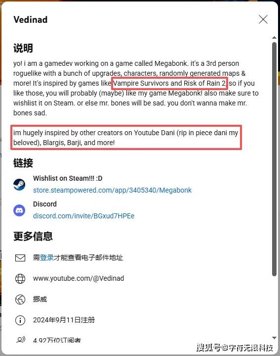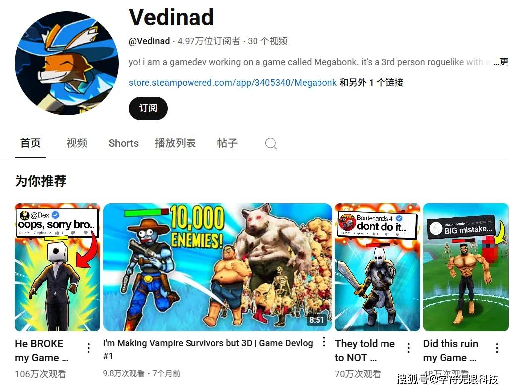 而在他不断发视频宣传自己的游戏《Megabonk》过程中,Vedinad自己在Youtube的账号积累了近5万粉丝,累计发了30条左右的视频,很多视频的播放量都有几十万次,俨然成了一个独游开发的“小网红”。