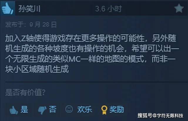 有玩家表示,“加入Z轴使得游戏存在更多操作的可能性,另外随机生成的各种坡度也有操作的机会,希望可以出一个无限生成的类似MC一样的地图的模式,而非一块小区域随机生成。”