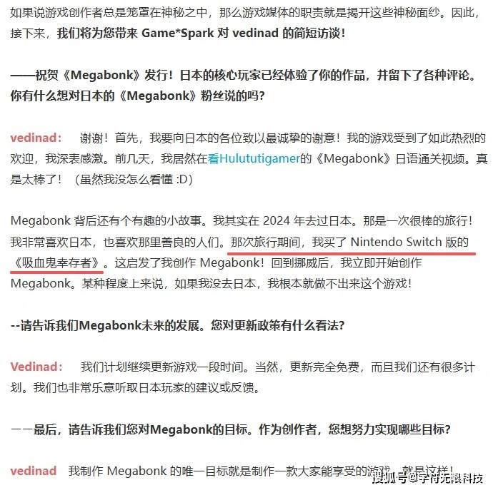 其中在一篇报道(来自Game*Spake对Vedinad的简要采访)特别提到,去年他在日本购入Switch版的《吸血鬼幸存者》并沉浸体验后,深受启发,萌生了创作一款融合此类玩法但更具三维空间感和无厘头幽默风格游戏的想法。