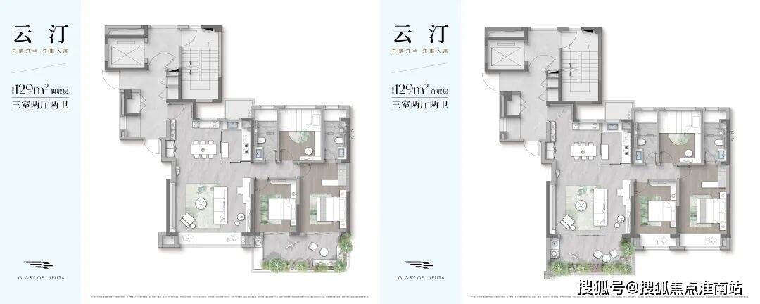 129㎡ 云汀 三室两厅两卫 奇数层:使用率约94% 偶数层:使用率约95%