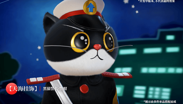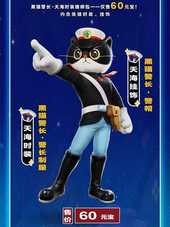 这次联动的核心亮点,就是天海和魏轻的专属联动外观,每一套都藏着满满的细节彩蛋。先看天海的套装,全套时装礼包仅需60元宝,包含黑猫警长·警长制服和警帽挂饰。制服的黑披风搭配警徽披帛气场拉满,还有专属的待机拔枪动作,站在聚窟洲里就是最靓的“警长”;警帽挂饰可以独立搭配,更惊喜的是有脱帽敬礼彩蛋,互动感直接拉满。