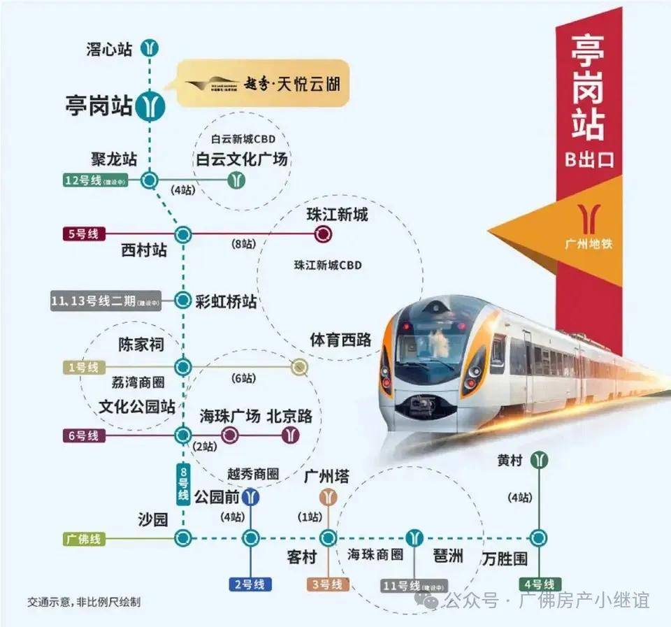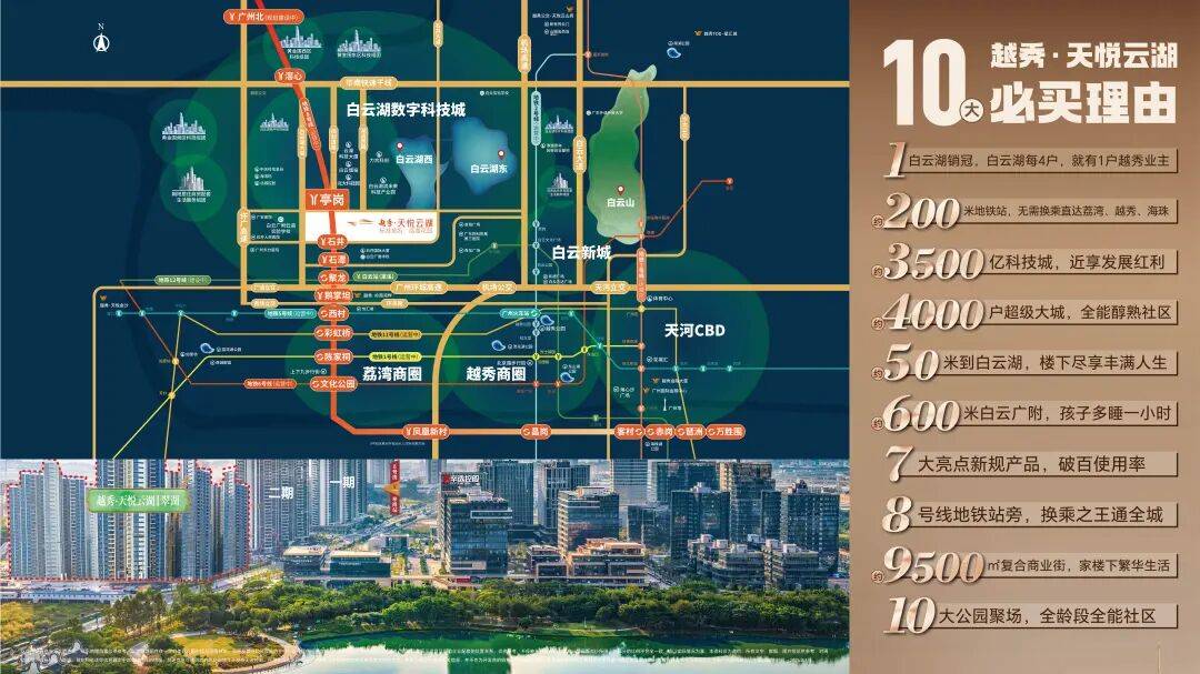 【越秀·天悦云湖】小区位于白云区白云湖数字科技城启动区,小区东北侧就是白云湖西湖,1期北门往东300米就是8号线亭岗地铁站A出口(实测)